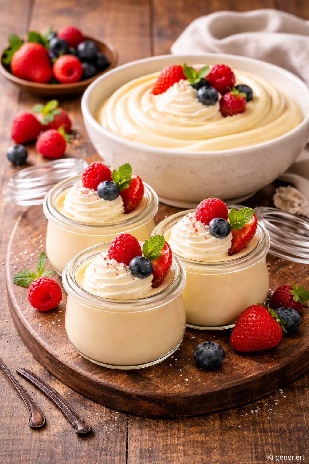 Serviert wird die Bayrische Creme stilvoll in einer Schüssel und eignet sich perfekt als edle Nachspeise oder als süßer Abschluss eines gelungenen Menüs.