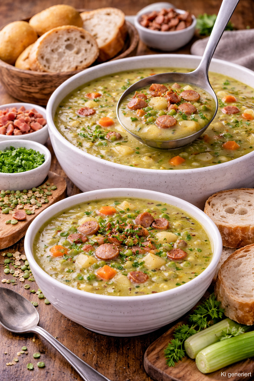 Traditionell servieren wir unsere Erbsensuppe mit einer herzhaften Fleischeinlage, die dem Gericht zusätzlich Tiefe und Würze verleiht.