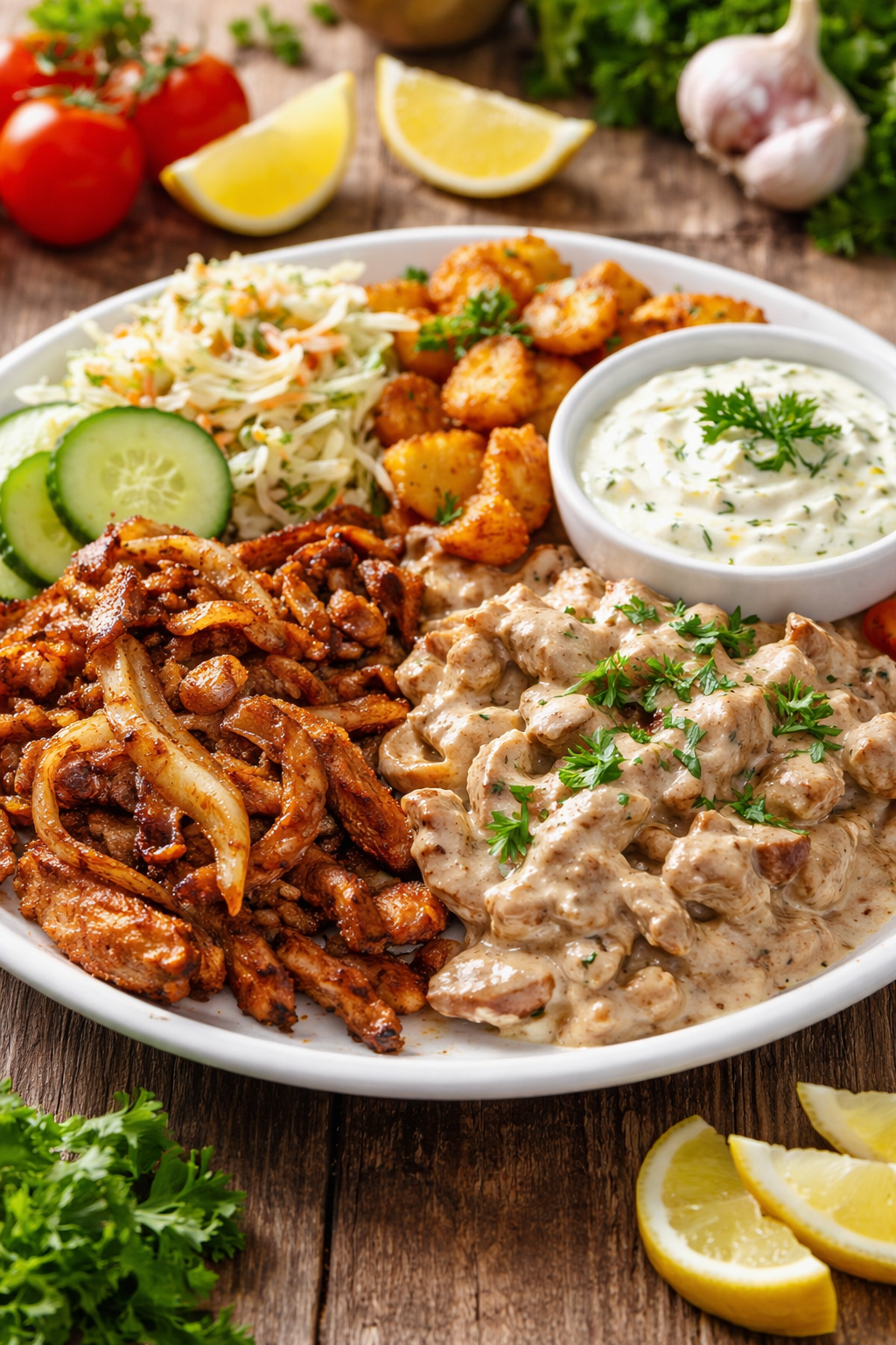 Zwiebelgyros, Sahnegyros, Bratkartoffeln,