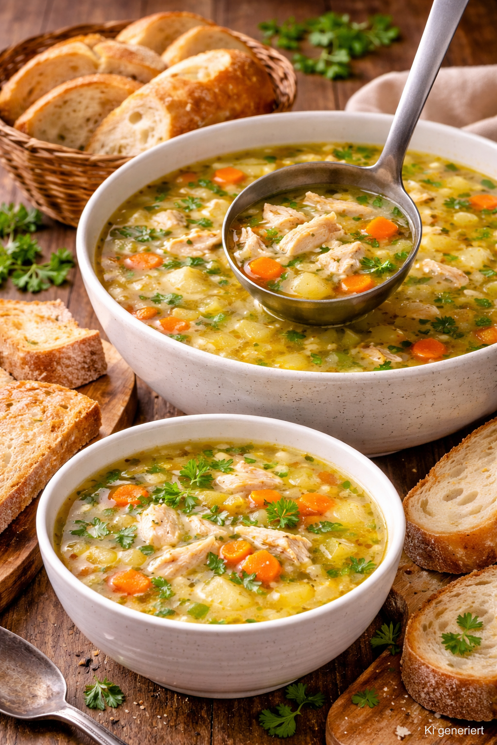 👉 Ab 20 Personen servieren wir unsere Hühnersuppe auf Wunsch mit ofenfrischem Brot – perfekt zum Dippen und Genießen.